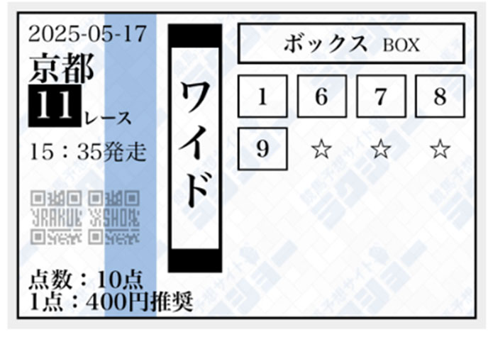 推奨金額通り、1点400円で購入し、合計4,000円分の馬券を購入しました。