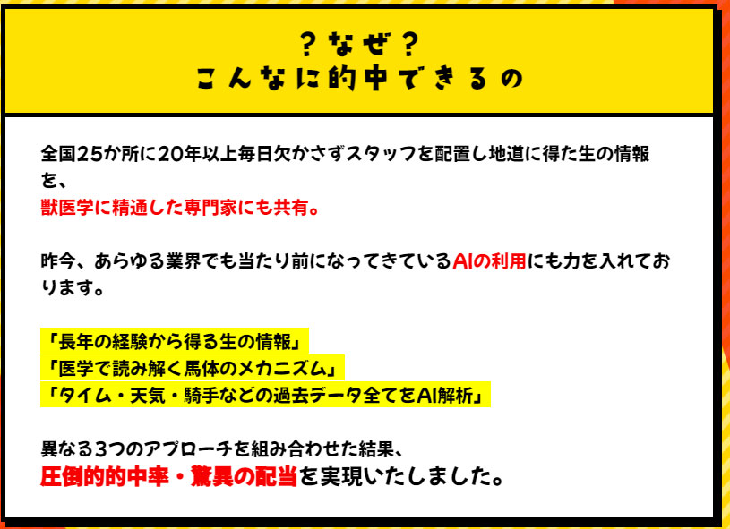 全国の競馬場に毎日スタッフを配置してその情報を獣医学の専門家に共有し、AIによる解析も組み合わせた予想を提供して圧倒的的中と驚異の配当を実現しているようです。