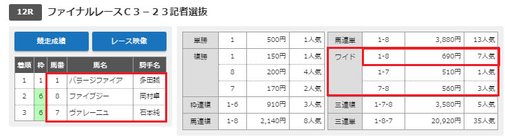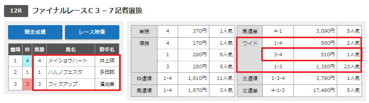 前回と同じくワイドのボックスですが今回は4頭で6点の予想となっておりました。
