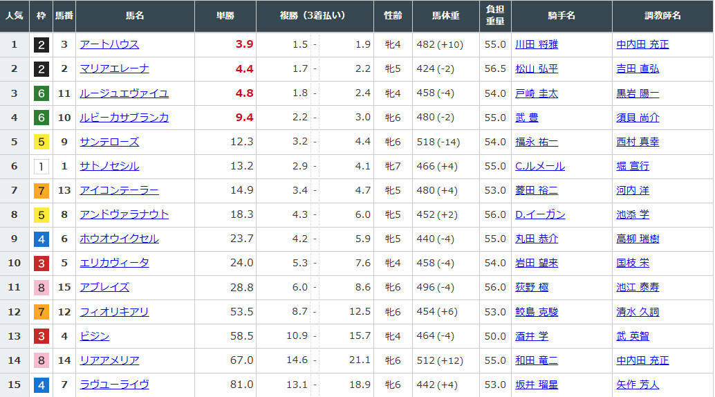 ③アートハウスが有利かなとは思ってましたが、天気も雨で重馬場で予想が難しく、オッズも11番人気まで混戦だという印象を受けました。