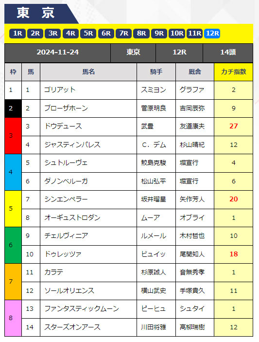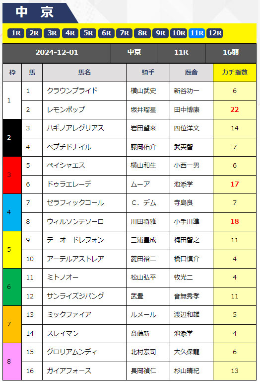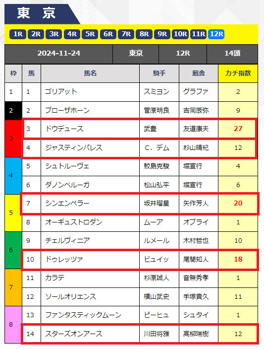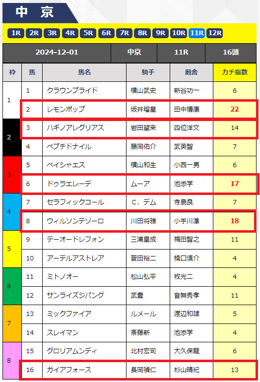 予想はこのようになっていて全頭の「カチ指数」という数字があり、その数字の高い馬は期待値が高いということのようです。