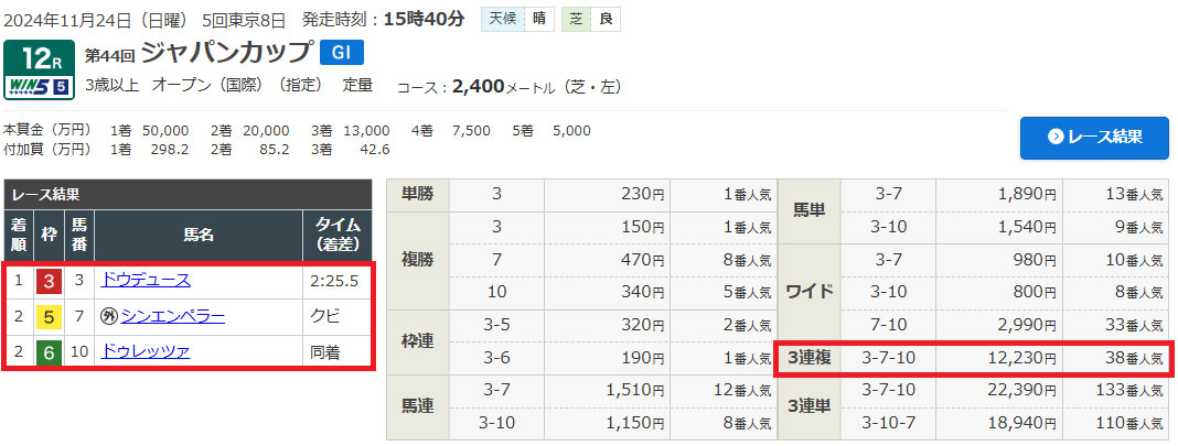 1番人気のドウデュースから上位人気と穴馬も絡んだ馬券になっています。