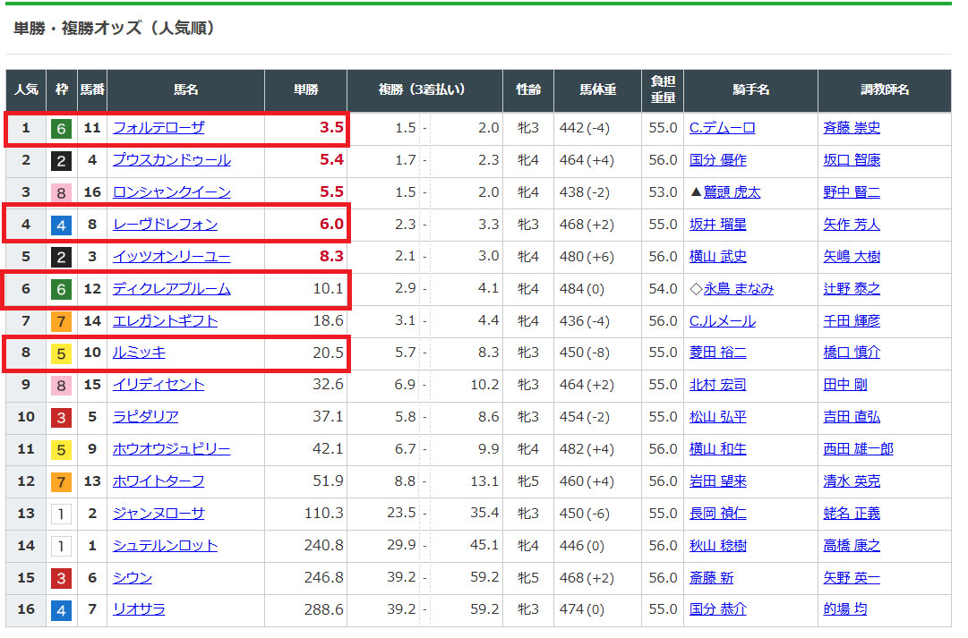 1番人気のレモンポップから上位人気と穴馬も絡んだ馬券になっています。