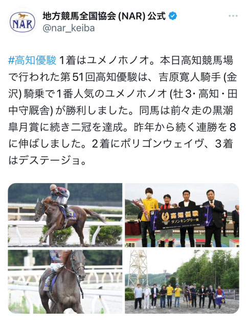 遠征帰りでしたが見事な3馬身差の圧勝でした。中央馬の3歳勢が強いのはもちろんですが、ユニコーンSと同日に行われた高知競馬の高知優駿(地方交流)でまた楽しみな地方馬が現れましたね!