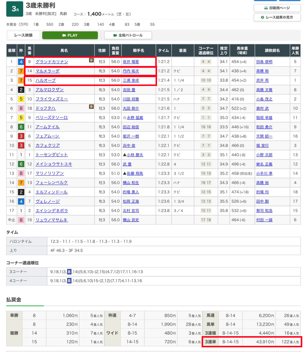 この的中は素晴らしいですね。1番人気の⑮ハルオーブが本命でしたが、人気薄7番人気の⑧グランドカリナンが勝ってくれて万馬券の決着になったので感謝したいです。