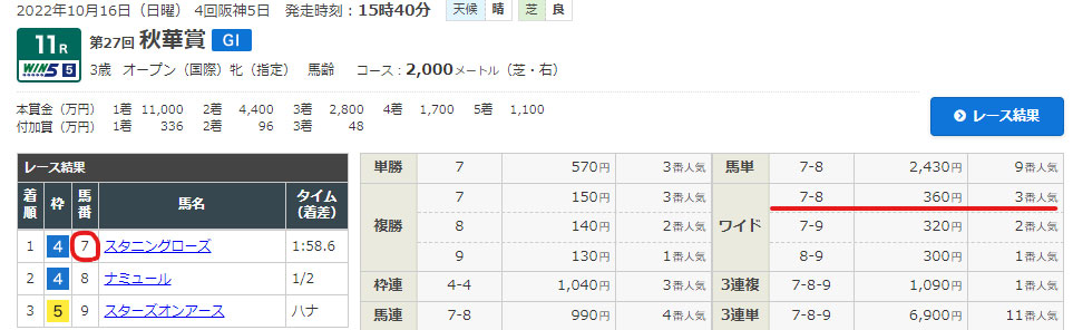 軸の⑦スタニングローズが見事1着に来てくれました。