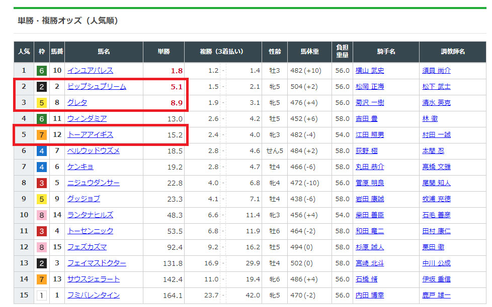 断トツ1番人気の馬ではなく5番人気の馬を軸にしているのでこれも美味しいオッズに期待したいです。