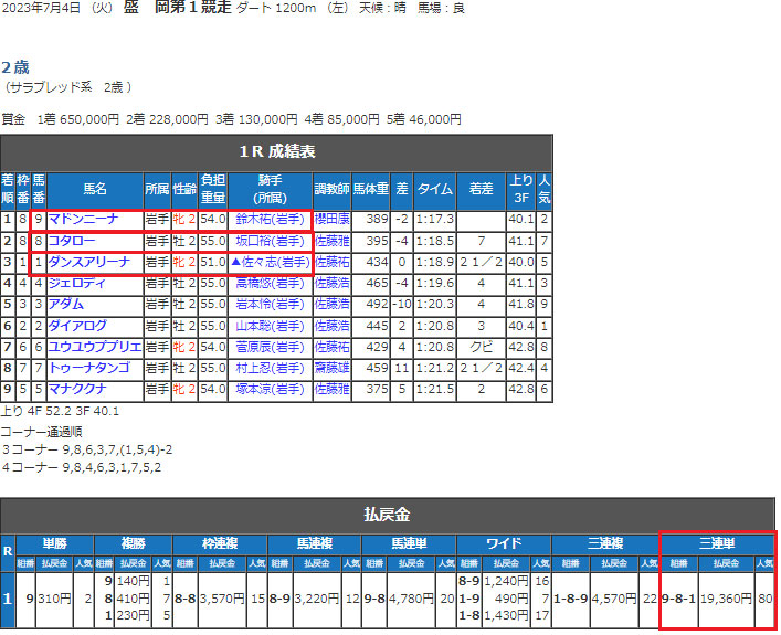 平日に検証を行ったので地方競馬になりますが、盛岡競馬場の予想でした。