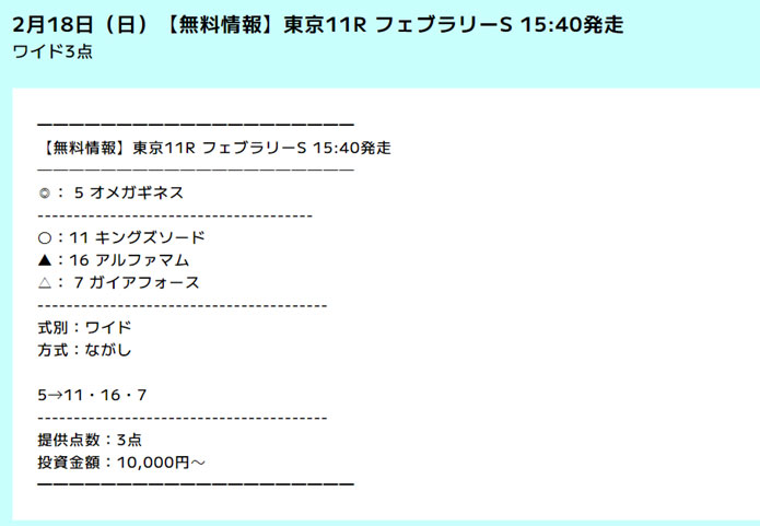 今回の【KEIBA×FAMILY】ではフェブラリーSを当てることができなかったのですが、【おもいで競馬】というサイトでは無料情報が見事的中していたようです。