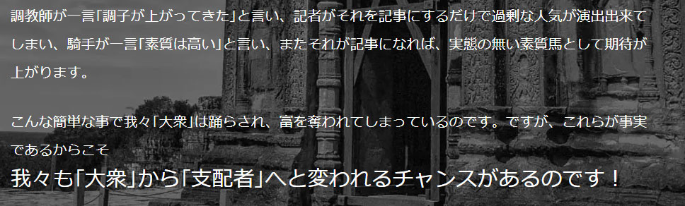 「疑念を確信へと変える新時代の競馬予想サイト」ということですが、新時代の競馬予想とはどのようなのでしょうか。