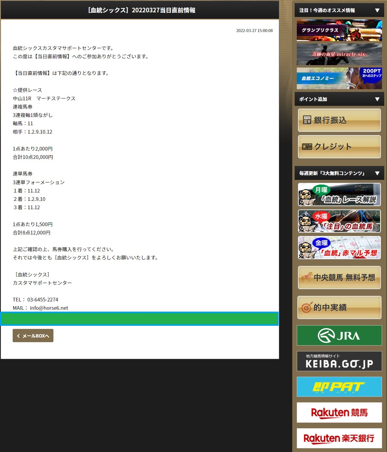 マーチステークス二種馬券的中ありがとうございます。 ドバイ完全攻略の不完全燃焼をしっかりカバーできました。 やっぱ頼りになるのはこの情報ですね ありがとうございます。