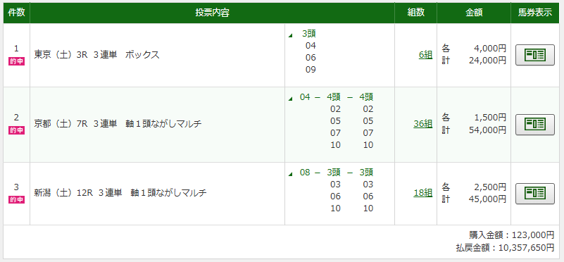 3連複でも159,290円もついて30万7780円払い戻しは一カ月の給料超えちゃったわ!