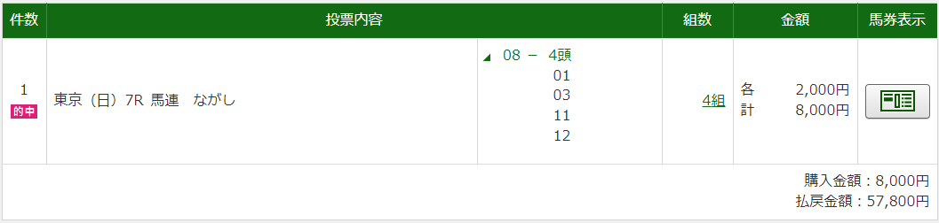はい無料情報で5万7800円の馬連いただきました(^_^)v 4点で当てられることなんてほぼないからありがたやありがたや
