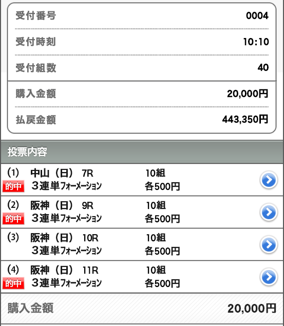 しかも3連単6点とか点数絞った買い目、4800円の馬券代(1点800円)が50万2240円になった。