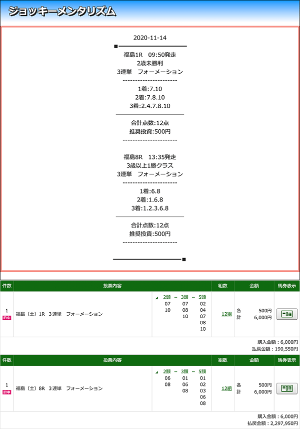 1レース目が約20万の的中だったので続く福島8Rも同じ位の的中額かと思ったけどなんと10倍の200万円越えでびっくりしています! 買い目を見た時にやけ2桁人気馬が入っているなと印象、下手したら不的中まで考えていたので想像を絶する的中額で衝撃的でした! あの感覚は忘れられないしまた味わいたいなと思い今週も有料情報に参加しました。 2週連続200万円超える勝利を手にしたら親孝行してあげたいと思います。