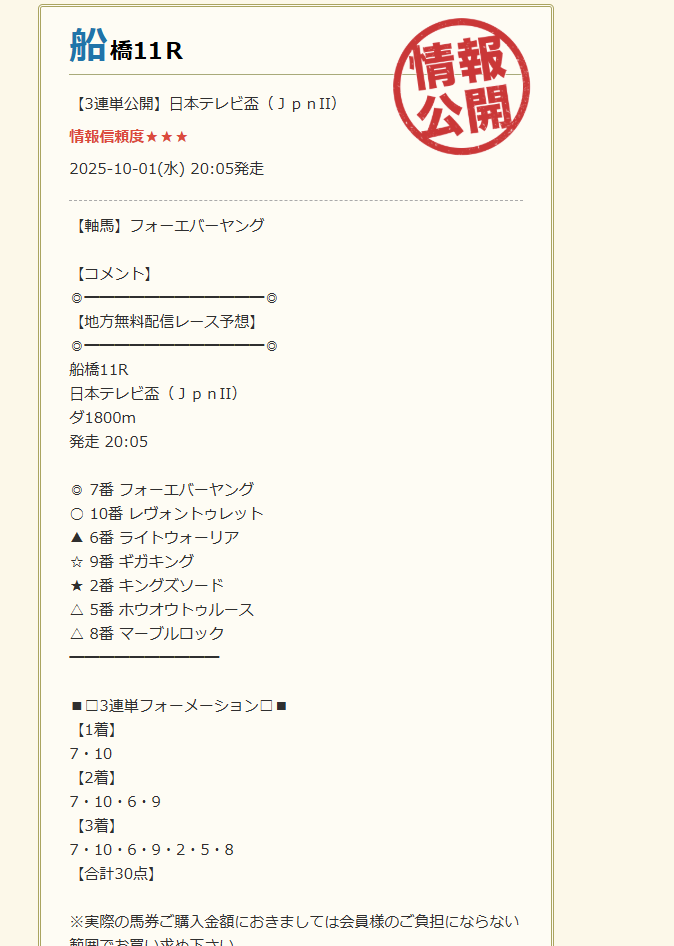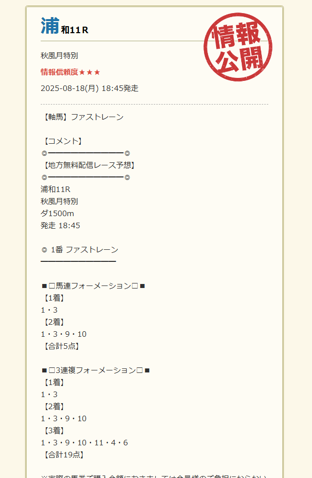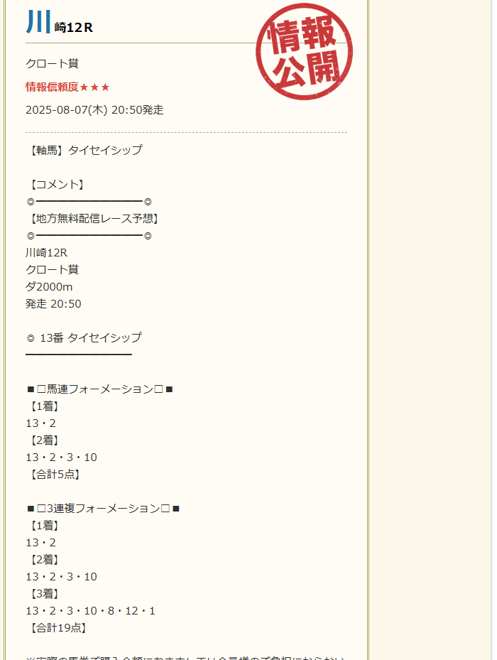 8/7の無料情報の馬券ダブル的中で45,400円的中貰えました、堅実的に5万前後の的中は嬉しいですね。 これが平日複数回貰えれば余裕で10万の壁超えてきそうです。